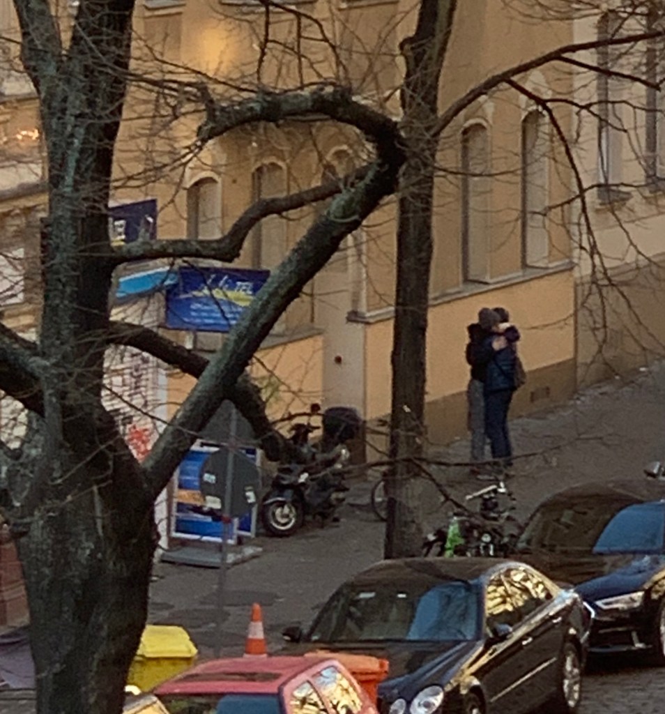 Zweiter Gedanke: Geht’s denen noch? (Haltet Euch zurück in der Öffentlichkeit, es ist Corona! Hättet ihr Euch nicht in der Wohnung verabschieden können? Natürlich nicht, ihr müsst der Welt, wenigstens der Straße, mindestens denen, die Euch beobachten durch schmierige Scheiben – verdammt ich muss die Fenster putzen – zeigen, wie verliebt ihr seid. Jööö.)