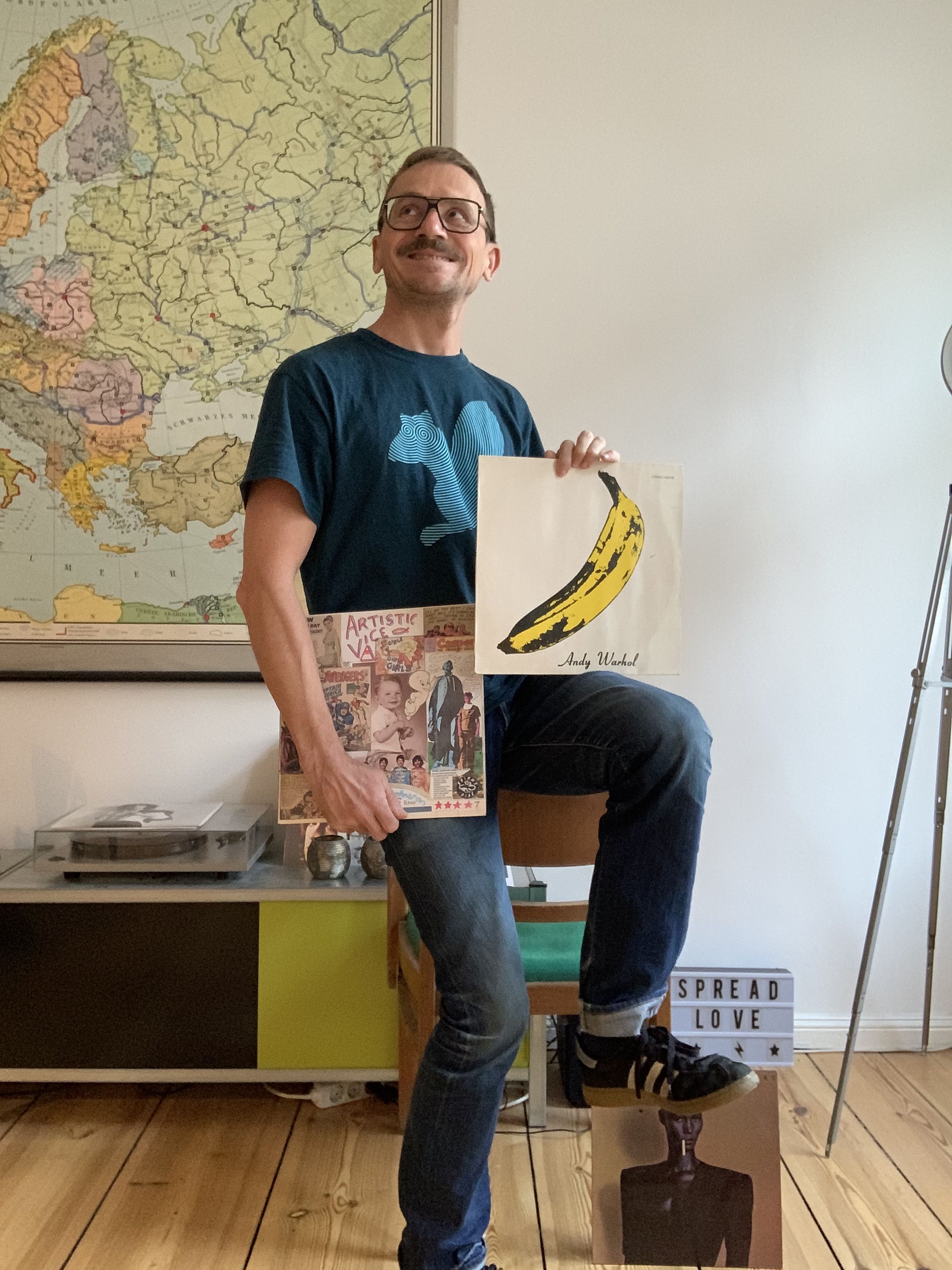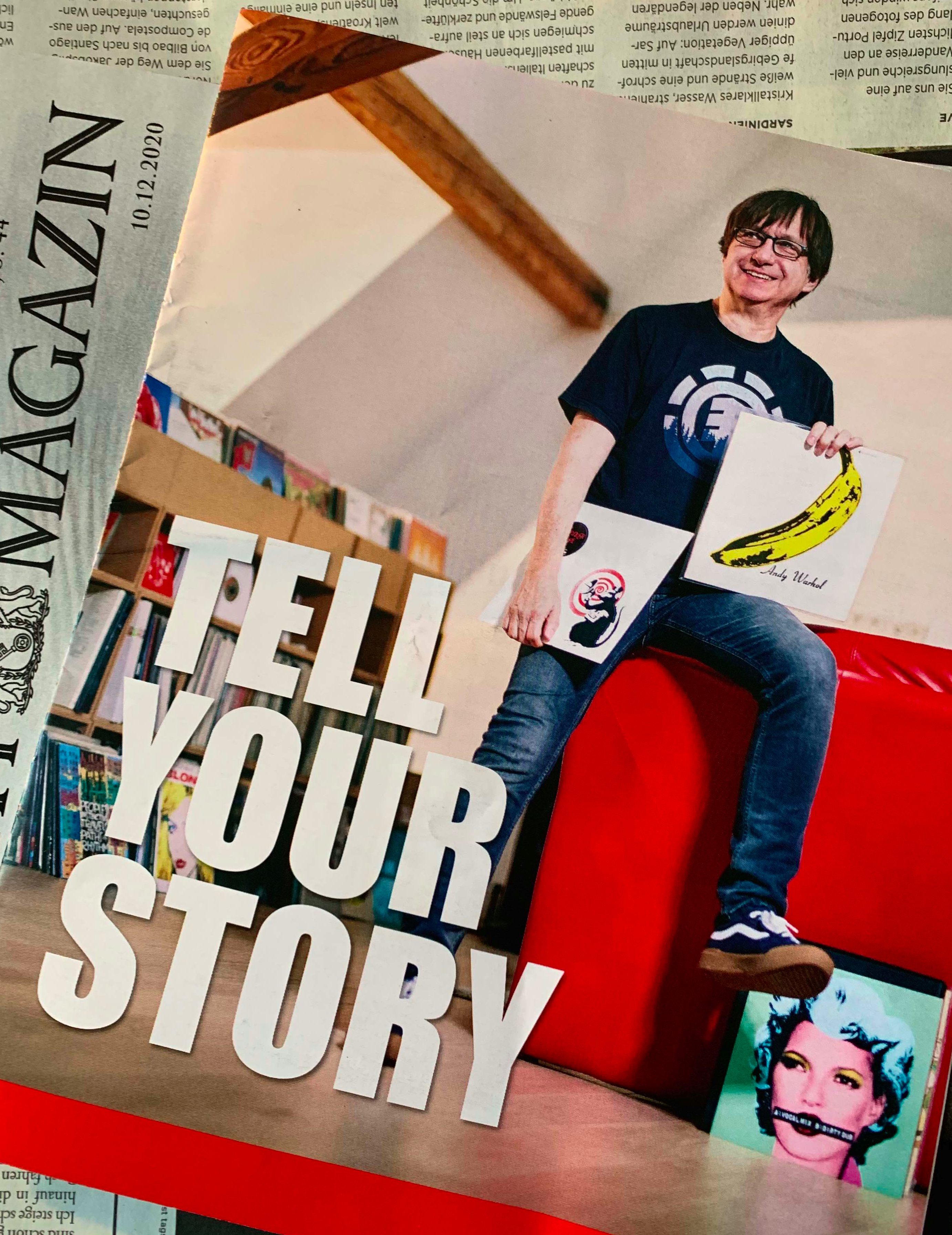 Also beginne ich damit, dass mich auf einer Werbebeilage ein vermutlich Gleichaltriger grinsend auffordert, meine Geschichte zu erzählen. Ein Blick in die Broschüre offenbart, dass es ein DJ namens Raimund Flöck ist, der sich mit dem legendären Bananenalbum auf dem Oberschenkel in total cooler Pose locker macht. Das Bild lässt mich nicht los. Ob es an der Banane liegt, am knallroten (Kunst?)Ledersofa oder an Raimunds Gesicht, dass, Pardon, eher zu einem Fraktionsmitglied der Grünen im Stadtrats Buxtehude passt, der das Stadtmotto „Schlau, wer schon da ist!“ ersonnen hat. Obwohl sich Grün und eine „funky dance night“ nicht ausschließen, gell, Raimund, dann wird es nämlich „richtig fett“.