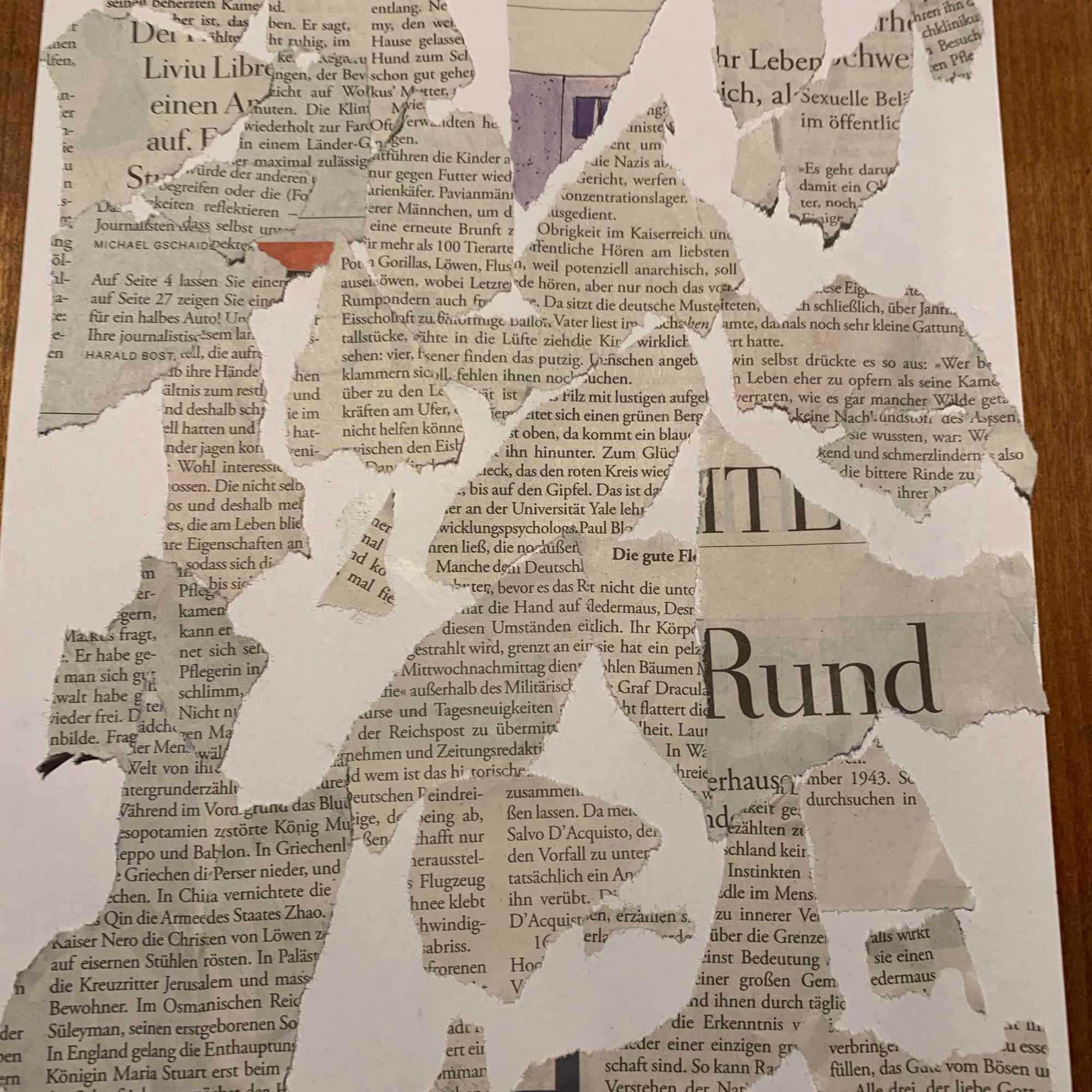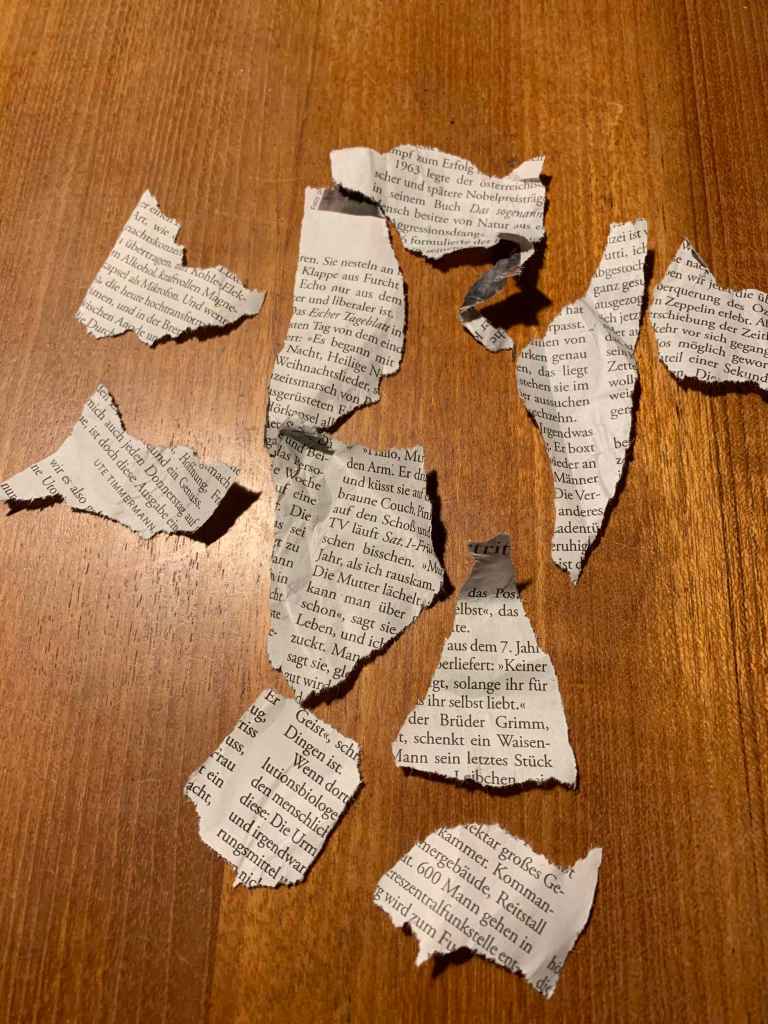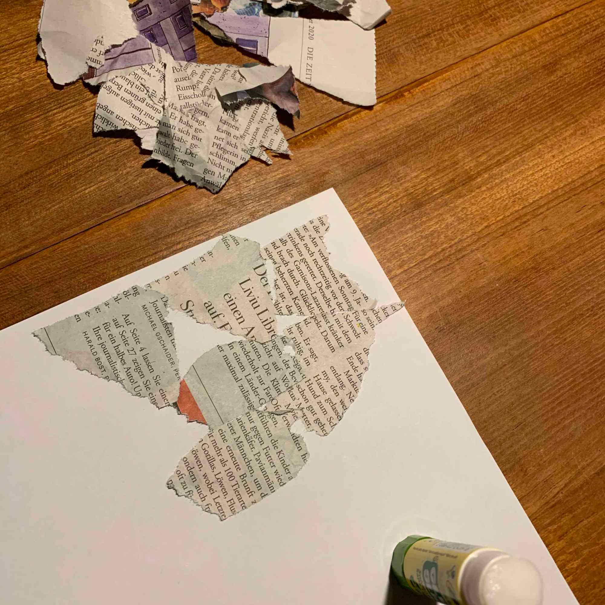 Wir kleben die Fetzen nach Gutdünken auf ein Blatt Papier.