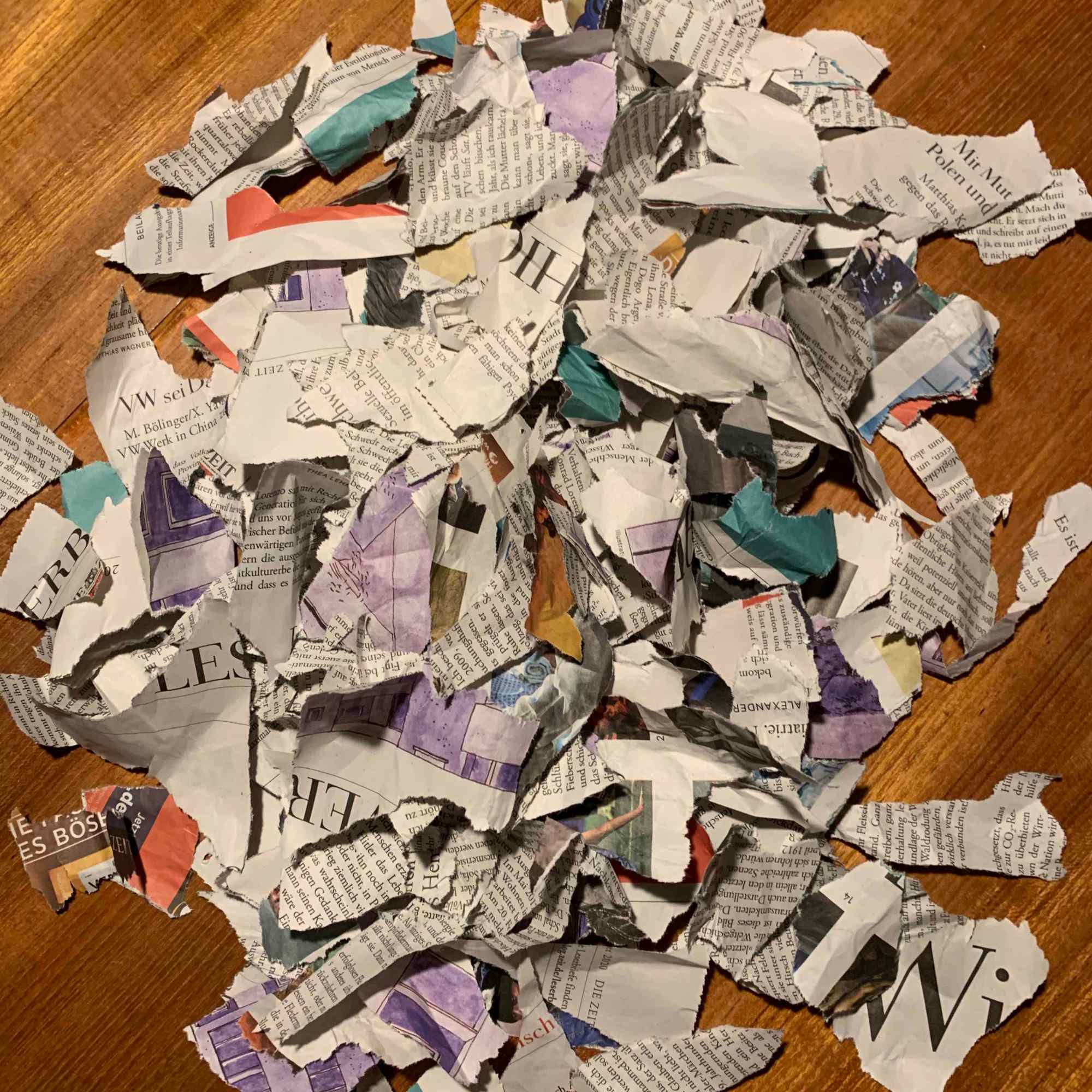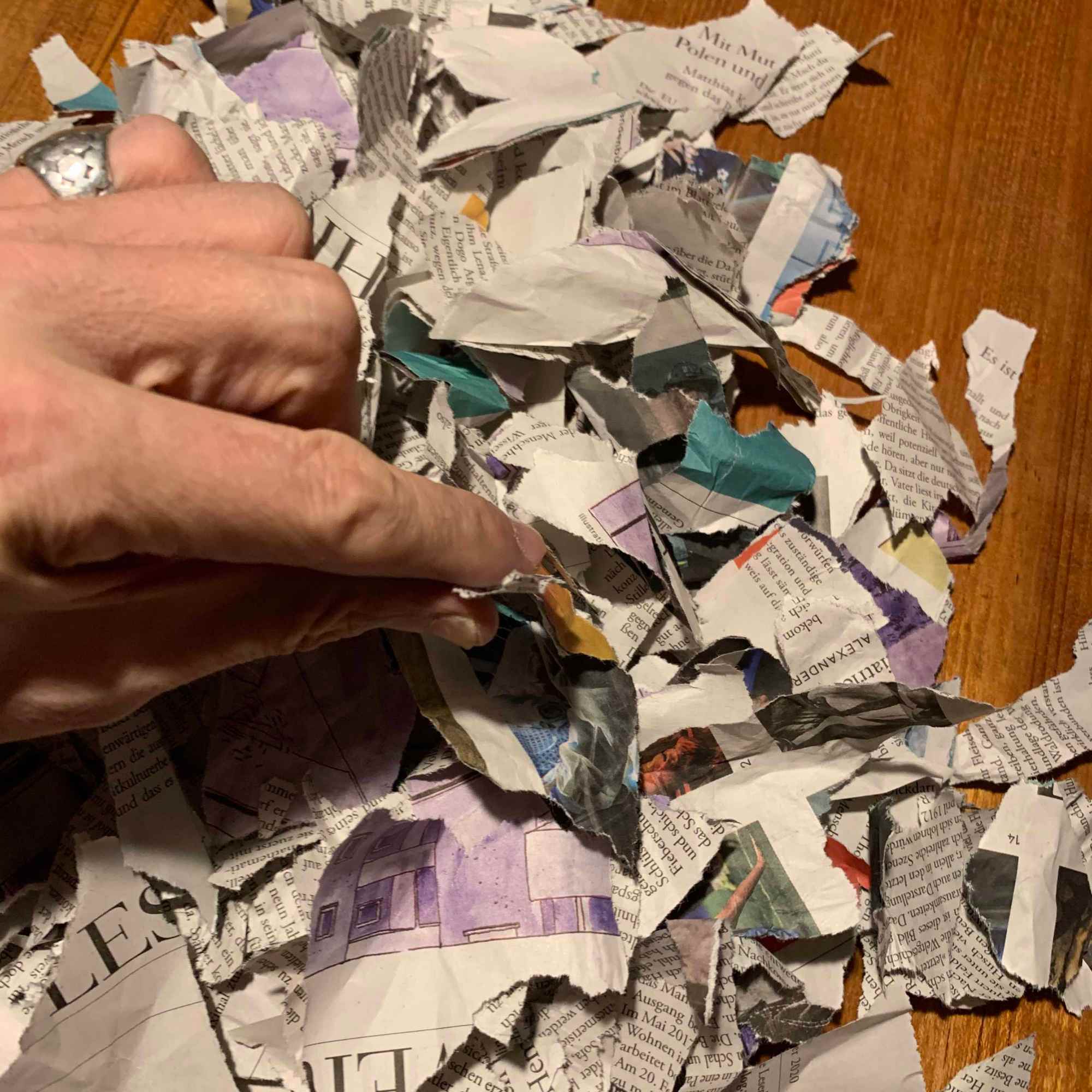 Wir reißen das Papier in kleine Fetzen (als wollten wir Papiermaché machen).